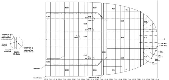 Plan view of the final layout of the forward deck plates. Plate outlines, molded lines for framing, and module break lines are included.