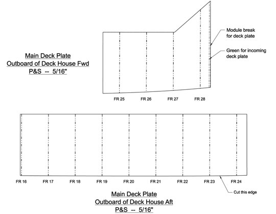 Expanded surfaces of the midship deck plates. All include provision for corner-to-corner joints, butts, etc., so edge trimming is minimal.